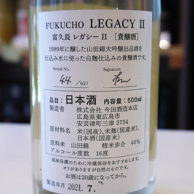 「富久長レガシー」は富久長で大切に熟成されていた過去の鑑評会出品酒を使って、約30年の時と現代の技を組み合わせて生まれた最上級の貴醸酒シリーズです。「LEGACY II」は、三段仕込みの時の仕込み水の代わりに、1989年醸造の「山田錦 大吟醸出品酒(雫酒 斗瓶どり)」を使用。さらにクエン酸が生成される白麹を使って、さわやかな酸味のあるタイプに仕上げています。貴醸酒ならではの上品な甘味と、白麹由来の酸味が合わさり、お料理と合わせても味わい深い一本です。またラベルに使っているのは、広島・歴清社で40年ほど前につくられたこちらもヴィンテージの銀箔紙。一枚一枚異なる風合いも楽しんでください。限定627本、シリアルナンバーと杜氏のサイン入りです。 商品スペック PRODUCT SPEC ※2021.7月製造 合わせる食べ物 PAIRING 肉や魚のグリル、天ぷらなど おすすめの飲み方 HOW TO DRINK 冷やして、常温 味わいチャート TASTE CHART おすすめポイント POINT 酒蔵紹介 1868年に創業。映画「カンパイ!日本酒に恋した女たち」で話題となり、英BBCが選ぶ「100人の女性」に選出された今田美穂さんが代表取締役と杜氏を務める『今田酒造本店』。代表銘柄の『冨久長(ふくちょう)』を始めとする日本酒やリキュールを、吟醸酒の故郷として知られる広島県東広島市安芸津で製造しています。「八反草」という、栽培の難しさから一度途絶えた酒米を復刻したことでも知られ、その功績と、出来上がったお酒の完成度は業界でも話題になりました。常に挑戦的な姿勢を崩さず、地元広島の牡蠣や魚介類に合った日本酒『海風土(シーフード)』など、革新的な商品開発も行っています。 保存場所 太陽光が降り注ぐ部屋で保管すると、わずか30分で日本酒の色が変わり(日光着色)、劣化臭である「びん香」「日光臭」も発生します。 温度管理 保存に最適な温度は日本酒の種類ごとに異なりますが、重要なのは高温を避けることです。 賞味期限 どんなに保存状態が良くても、日本酒は瓶詰めされてから劣化していきます。