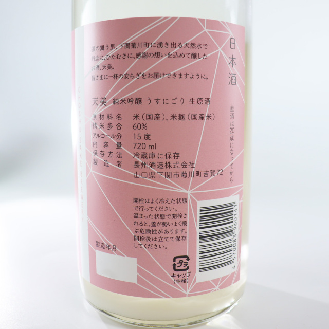 「天美 純米吟醸 うすにごり 生原酒(桃天)」は、季節限定!天美の人気商品です。販売初年度から即完となった数量限定のうすにごり。にごりのほのかな甘みと透明感のある酸、アクセントを添える微かな苦みとガス感が、豊かな風味を引き立てます。山口から春を告げる、フレッシュな生原酒をどうぞ!