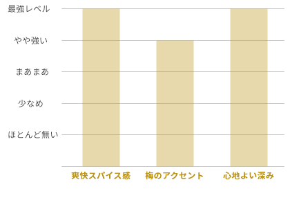 | 原材料 | ボタニカル:ジュ二パ-ベリ-(マケドニア)、山椒(山梨県)、小梅(山梨県)、芳樟(山梨県)、ベ-スアルコ-ル:ニュ-トラルスピリッツ |