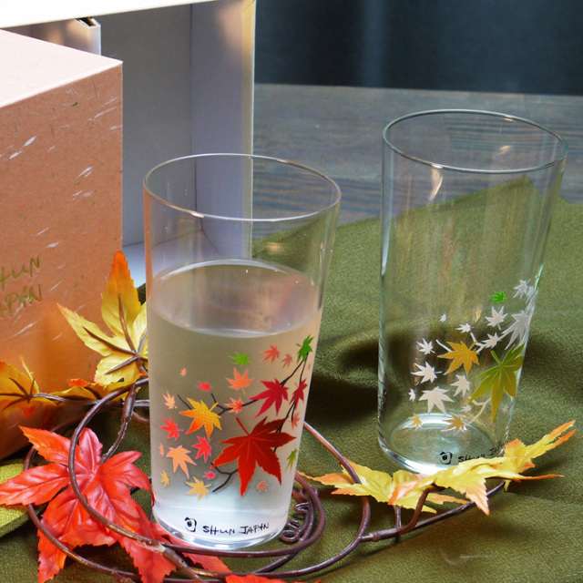 テーマは赤く色付く紅葉。冷たい飲み物を注ぐともみじが赤く染まります。