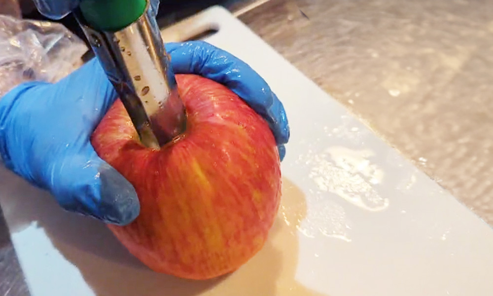 たっぷり日差しを浴びて完熟した状態で収穫したリンゴを直接農家から仕入れています。届いたばかりの新鮮なリンゴの芯を取りきリンゴシロップを作ります。ハンドメイドならではの深い味わいに仕上がります。